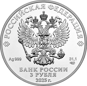Аверс: в центре — рельефное изображение Государственного герба Российской Федерации, над ним вдоль канта – надпись полукругом «РОССИЙСКАЯ ФЕДЕРАЦИЯ», обрамленная с обеих сторон сдвоенными ромбами, под гербом слева – обозначения драгоценного металла и пробы, справа – содержание химически чистого металла и товарный знак монетного двора, внизу в центре в три строки – надпись «БАНК РОССИИ», номинал монеты «3 РУБЛЯ», год выпуска «2025 г.».