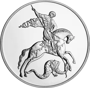 Реверс: рельефное изображение Георгия Победоносца на коне, поражающего копьем змея.