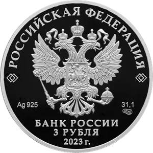 Аверс представляет собой выступающее изображение официального символа Российской Федерации. Выше символа, вдоль периметра, расположена надпись дугой: «РОССИЙСКАЯ ФЕДЕРАЦИЯ», которую с двух сторон украшают пары ромбов. Под эмблемой находятся: слева указание на драгоценный металл и его пробу, справа масса чистого металла и знак чеканки. В нижней части, распределённая на три строки, находится надпись: «БАНК РОССИИ», а также номинал: «3 РУБЛЯ» и дата выпуска: «2023 г.».