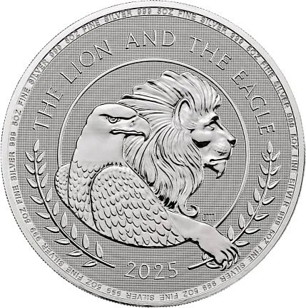 Надпись: THE LION AND THE EAGLE 2025 JM 5 OZ FINE SILVER 999