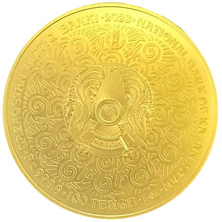 На аверсе Герб Казахстана и надписи: "KAZAKHSTAN ULTTYQ BANKI" и "NATIONAL BANK OF KAZAKHSTAN" - эмитент, "2024" - год выпуска, "1 oz" - вес, "Au 999,9" - проба драгоценного металла, "100 ТЕNGE" - номинал.