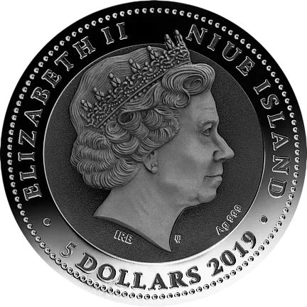 На аверсе монеты портрет Ее Величества Королевы Елизаветы II и надписи: “ELIZABETH II” - имя королевы, “NIUE” - страна-эмитент, “2019” - год выпуска, “5 DOLLARS” - номинальная стоимость.