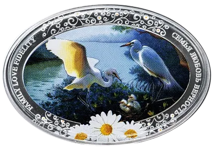 Реверс: В центре – цветное изображение семьи аистов в естественной среде обитания. По краю - рельефное изображение замысловатого орнамента и цветное изображение ромашек. Справа и слева надписи: FAMILY LOVE FIDELITY (СЕМЬЯ ЛЮБОВЬ ВЕРНОСТЬ).