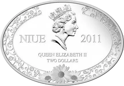 Аверс: В центре - рельефное изображение портрета Её Величества Королевы Елизаветы II. Справа и слева от портрета надписи: NIUE (Ниуэ) и год выпуска 2011. Снизу надписи: QUEEN ELIZABETH II (королева Елизаветы II) и номинал монеты TWO DOLLARS (2 доллара). По краю - рельефное изображение замысловатого природного орнамента и ромашек.