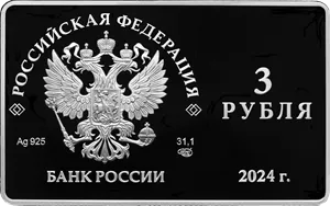 Аверс: в левой части монеты прямоугольной формы – Государственный герб Российской Федерации, над ним – надпись полукругом «РОССИЙСКАЯ ФЕДЕРАЦИЯ», обрамленная с обеих сторон сдвоенными ромбами, под гербом слева – обозначения драгоценного металла и пробы сплава, справа – содержание химически чистого металла и товарный знак монетного двора, внизу – надпись «БАНК РОССИИ»; в правой части монеты в две строки – номинал в две строки «3 РУБЛЯ», внизу – год выпуска «2024 г.».