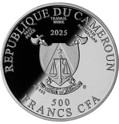 На аверсе монеты изображен герб Камеруна, с надписями: "REPUBLIQUE DU CAMEROUN" - страна-эмитент, "Ag 999" - проба Серебра, "500 FRANCS CFA" - номинальная стоимость, "2025" - год выпуска.