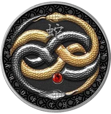 На реверсе монеты изображены два переплетенных змеи, одна из Золота, другая из Серебра, формирующие сложный узор с вставкой из красного кристалла в центре. Дизайн включает надпись "蛇" – китайский иероглиф, обозначающий "Змея".